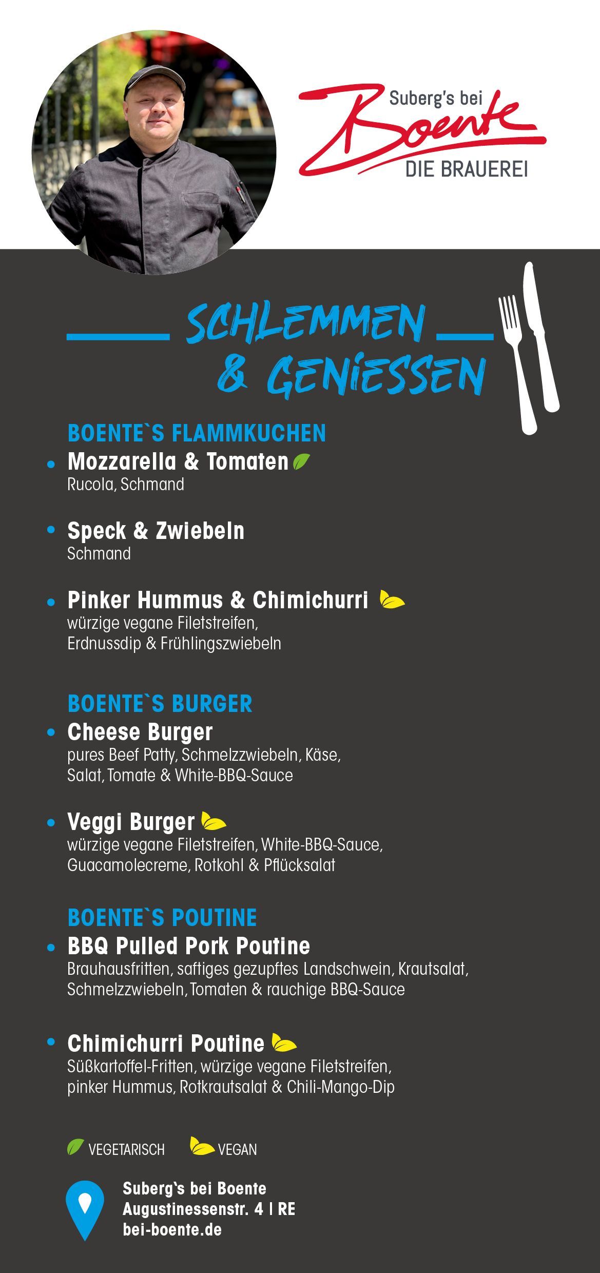 „Wir brauen selbst, kochen regional, bewirten mit Herz und viel Geselligkeit“, so lautet das Motto von Suberg’s bei Boente - der Hausbrauerei. Geschichtsträchtige Gemäuer mit modernem Brauhauscharakter und stilvoller Inneneinrichtung laden ihre Gäste zum selbstgebrauten und frischgezapften Bier ein. Neben vielen Aktionsbieren wie Boente’s Winterbier, Karnevalsbier, Maibock und Weizenbier uvm. stehen ganzjährig Boente‘s Hell, Dunkel und das Märzen auf der Karte. Jedes Aktionsbier wird traditionellen Fassanstich angeschlagen. Der Braukeller steht für Besichtigungen jederzeit zur Verfügung, nach dem Motto „Dabei sein, wenn Genuss entsteht“.