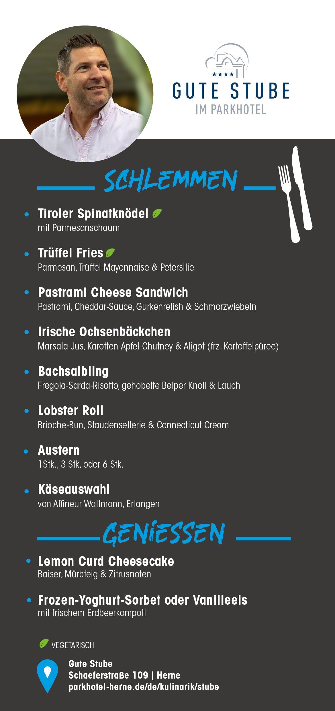 Nehmen Sie Platz, schalten Sie vom Alltag ab, genießen Sie die Ruhe und lassen Sie sich kulinarisch verwöhnen. Ob ausgedehntes 5 Gänge Menü mit Familie & Freunden in der "Guten Stube" oder geselliges Beisammensein im Stübchen. Im Parkhotel Herne fühlt sich jedermann gleichermaßen willkommen und spürt sofort die persönliche Atmosphäre des Hauses.